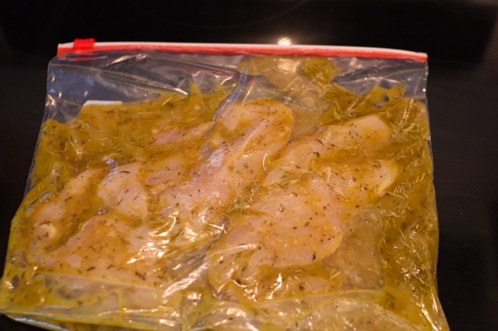 Allow the chicken to sit in the marinade a couple of hours. Sam the Cooking Guy only marinated his for 1-1.5 hours. I allowed ours to marinate for about four hours.