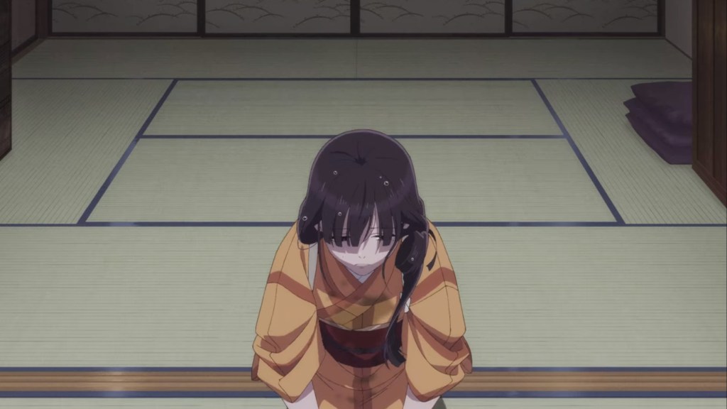 The episode begins with a soliloquy of our main protagonist, Miyo. Her words are sorrowful, beginning to paint a picture of someone in despair. In the next scene, Miyo is splashed with tea by her younger sister. Miyo is a servant in her own home. The stepmother and father do nothing to correct the younger daughter, Kaya. In fact, they participate in the verbal abuse. Talk around the home solidify that Miyo is nothing more than a nuisance in her own home.