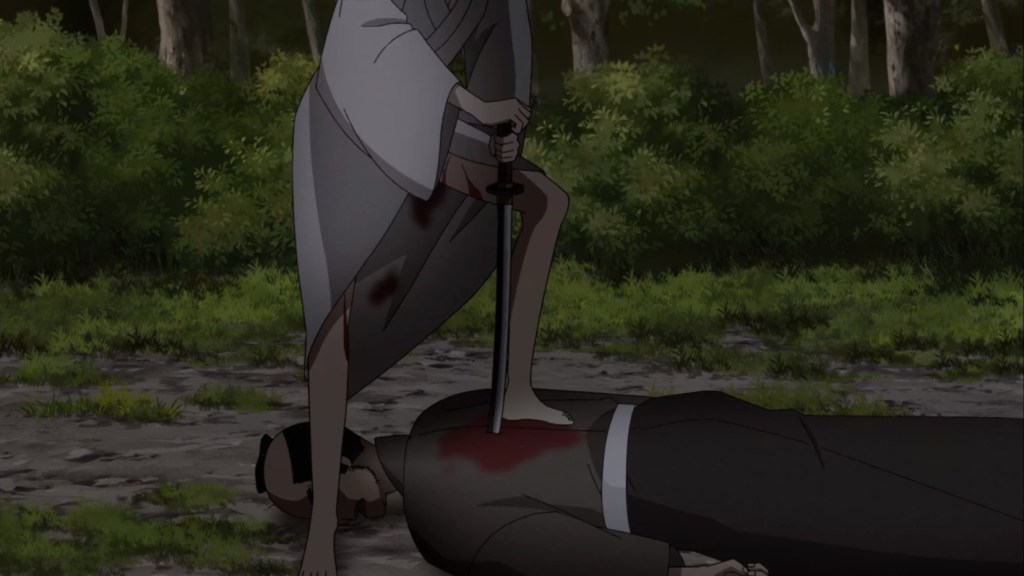 In a flashback, we are taken to the moment when Iemitsu, originally named Chie, is taken from her mother. Samurai storm the house and kill the mother and servant, leaving Chie before Kasuga. Kasuga then cuts Chie’s hair and begins her transformation as a girl living as a boy. When she is older, in defiance, Chie leaves the protected part of the estate. She comes across a man that promptly rapes her. Kasuga finds Chie bleeding over the dead body of her abuser.