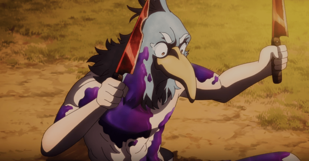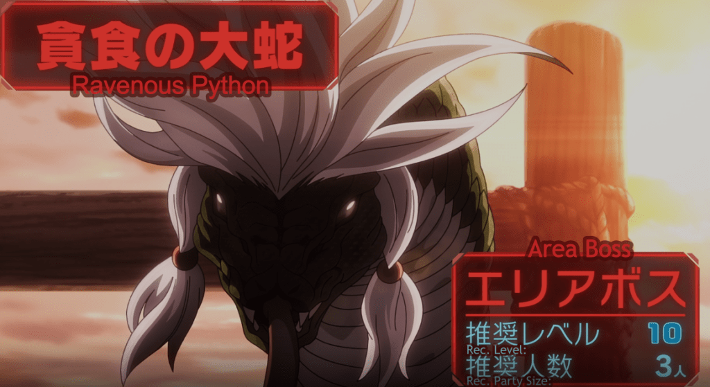 Sunraku devises that he only has four minutes before he dies of the poison. He realizes the snake’s scales make it too hard to land critical hits. Therefore, he pierces the scales and makes his own critical hitbox. He continually attacks the weak spot he made. However, this is not enough. As the snake seems to have the upper hand, Sunraku manages to reverse the tables and defeat the area boss.