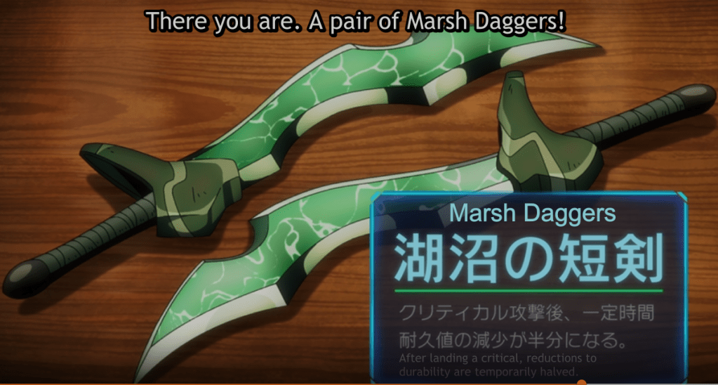 In his next session, Sunraku explores Secondale. He buys the cheapest armor so people will stop staring at his half-naked avatar. He also goes to sell items and pick up a new weapon. However, he finds his Vorpal weapons are much better than the vendor’s wares. The vendor then tells him he could make better weapons if he brings the supplies. Sunraku realizes that an influx of new players could mean a resource shortage, so he does his best to mine as much as he can. Finding rare materials, the craftsman offers a special weapon that he could make. Sunraku orders two. While waiting, he goes and buys items for his adventures.