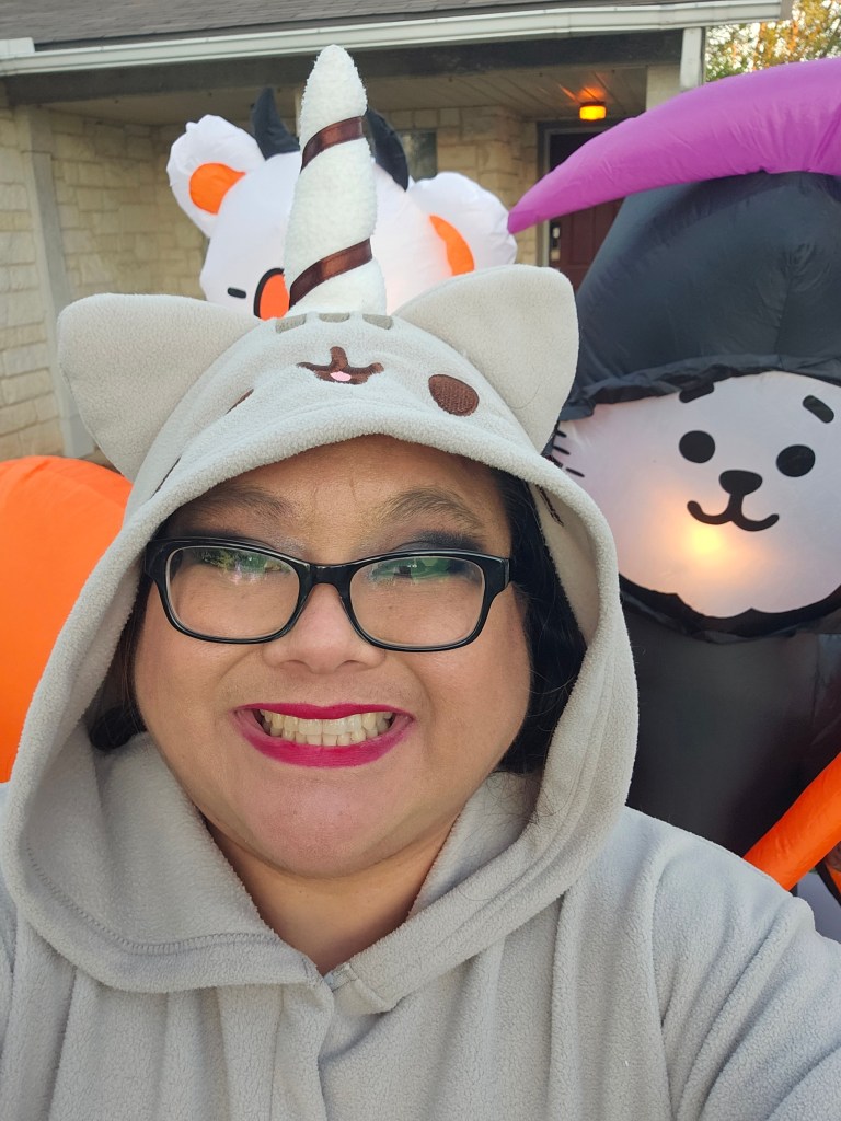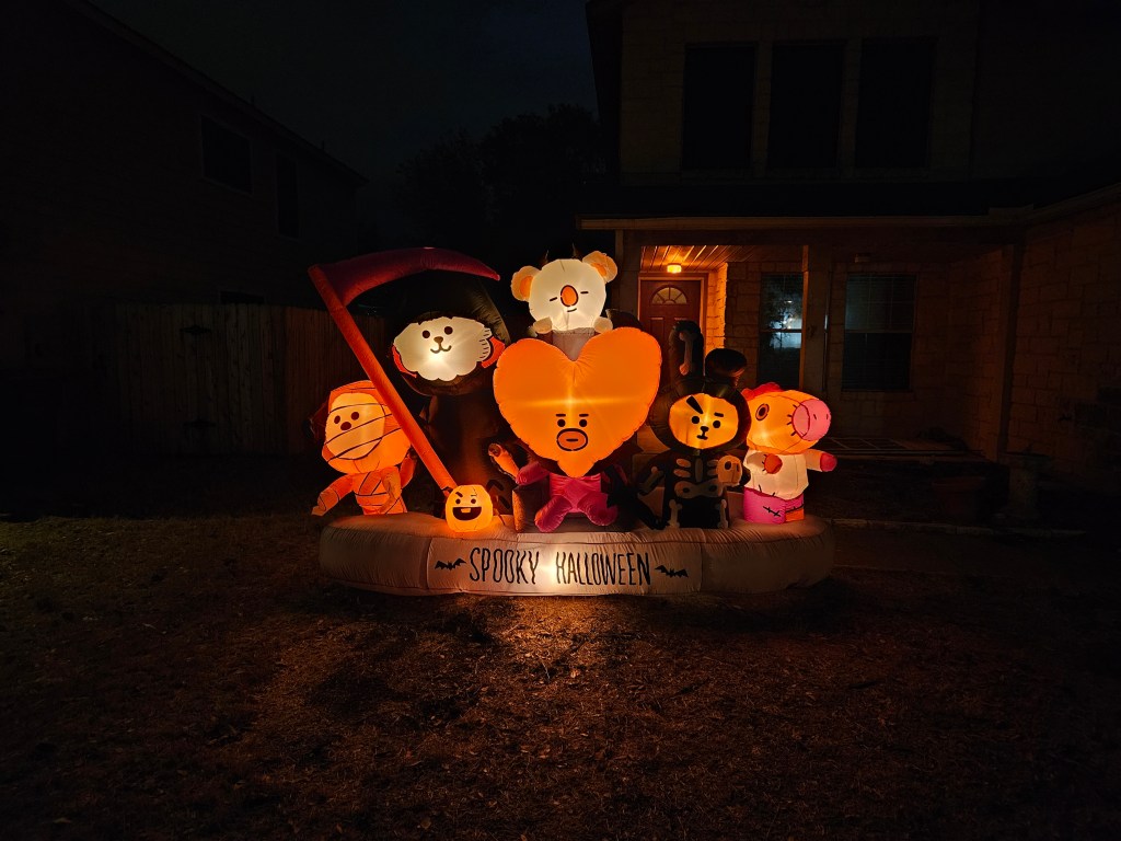 For the first time in a long time, we handed out candy on Halloween. We had such a good time sitting outside and handing candy to the littles. We saw so many creative and cute costumes. The best costume of the night was easily the little girl dressed as Nezuko from Demon Slayer. I asked her where Tanjiro was and she smiled. I was able to use my BT21 Halloween inflatable. I wasn’t able to put it out during the week before because of all the rain, but luckily, Halloween was a dry day/night. I put on my adult onesie of Pusheen the Cat.