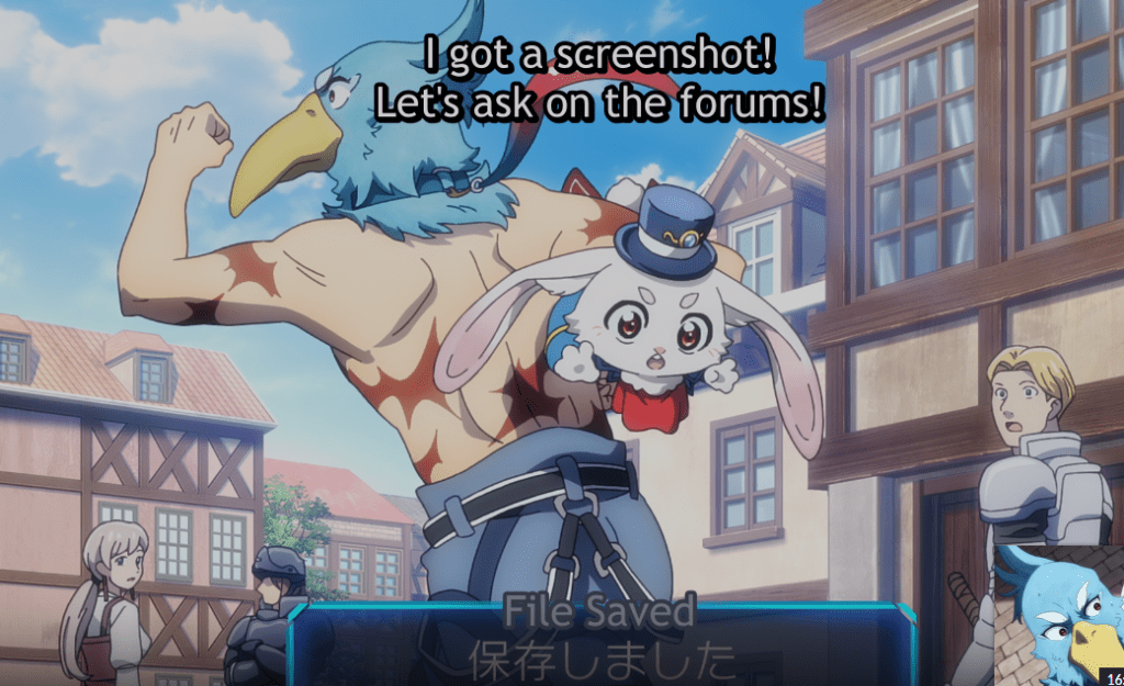 Rei-chan is still on her hunt for Sunraku, in-game, and in real life. She pops into the game store to see if he’s there. The shopkeeper teases her and tells her that he hasn’t stopped by. She asks about Rei-chan’s hunt for Sunraku, but Rei-chan divulges that he hasn’t exactly gone the normal route by skipping the tutorial city entirely.