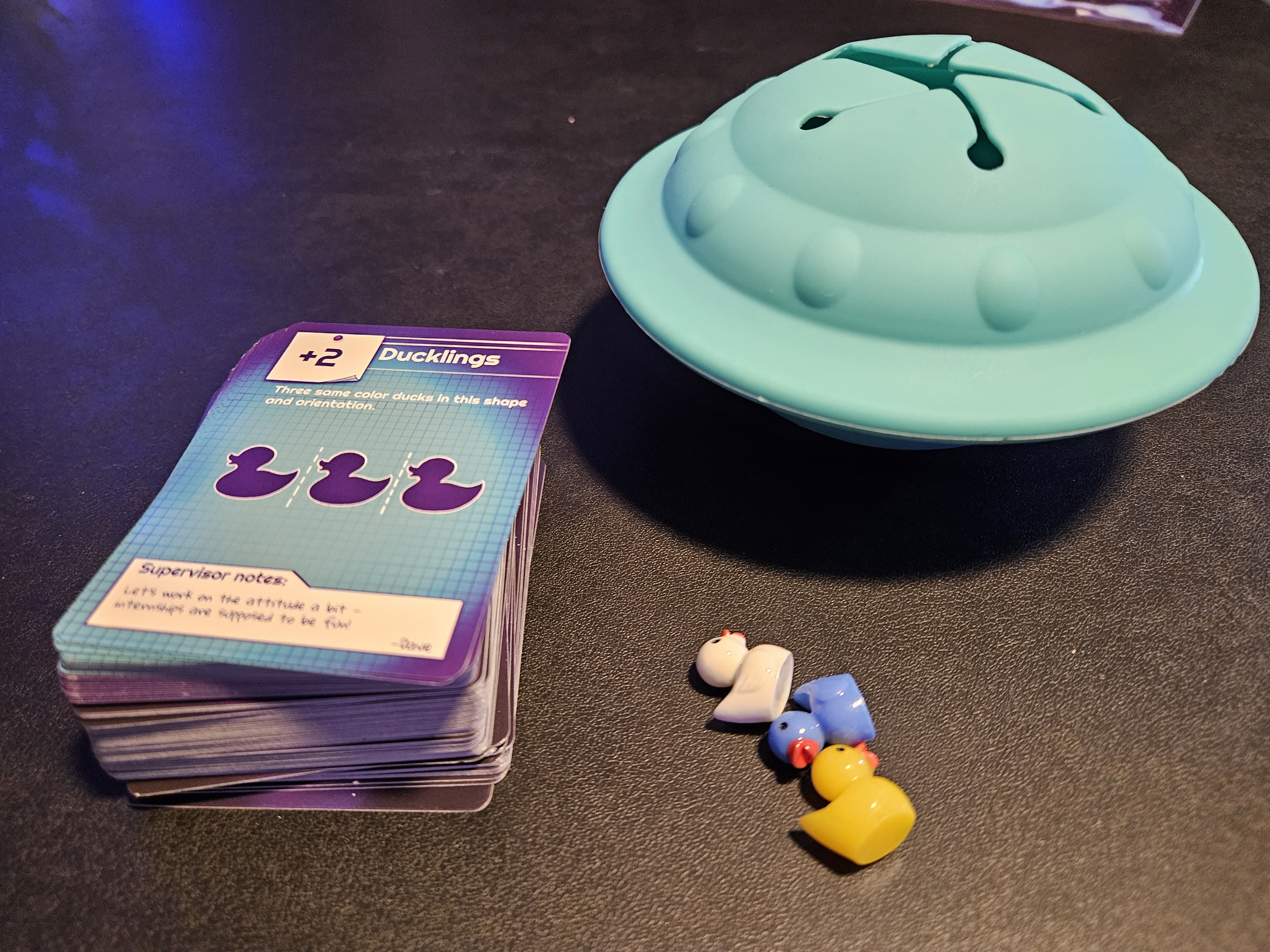 You are an intern on a UFO. You are given assignments to abduct ducks from your supervisor, Dave. You use action cards to rearrange your ducks or your opponent’s ducks. When you can match the ducks to the assignment cards, you can abduct the ducks into the UFO. You then replenish your ducks to keep the ponds full.