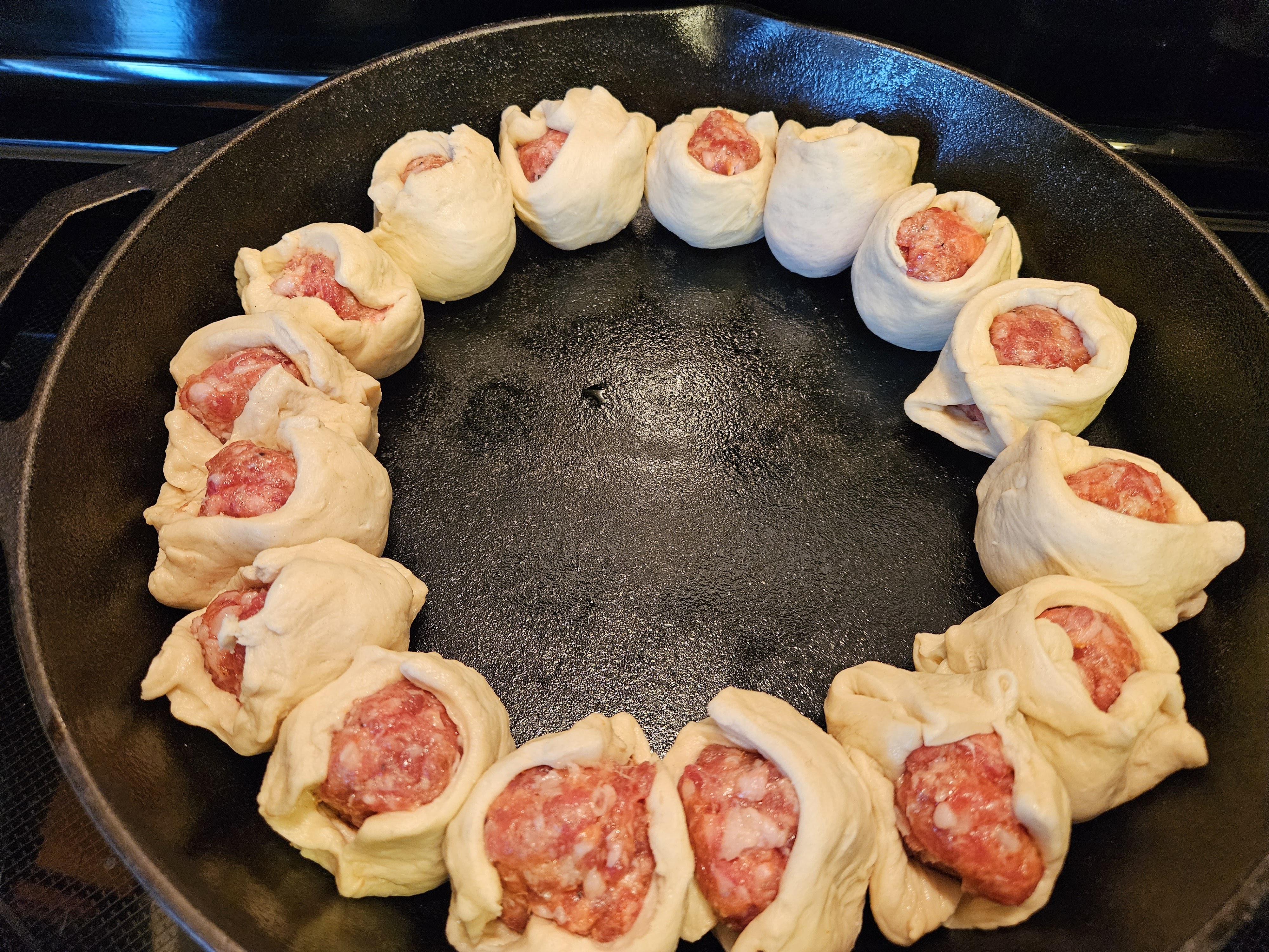 - Wrap a piece of dough around the meatballs. You want to leave a peephole for the sausage to peek through.