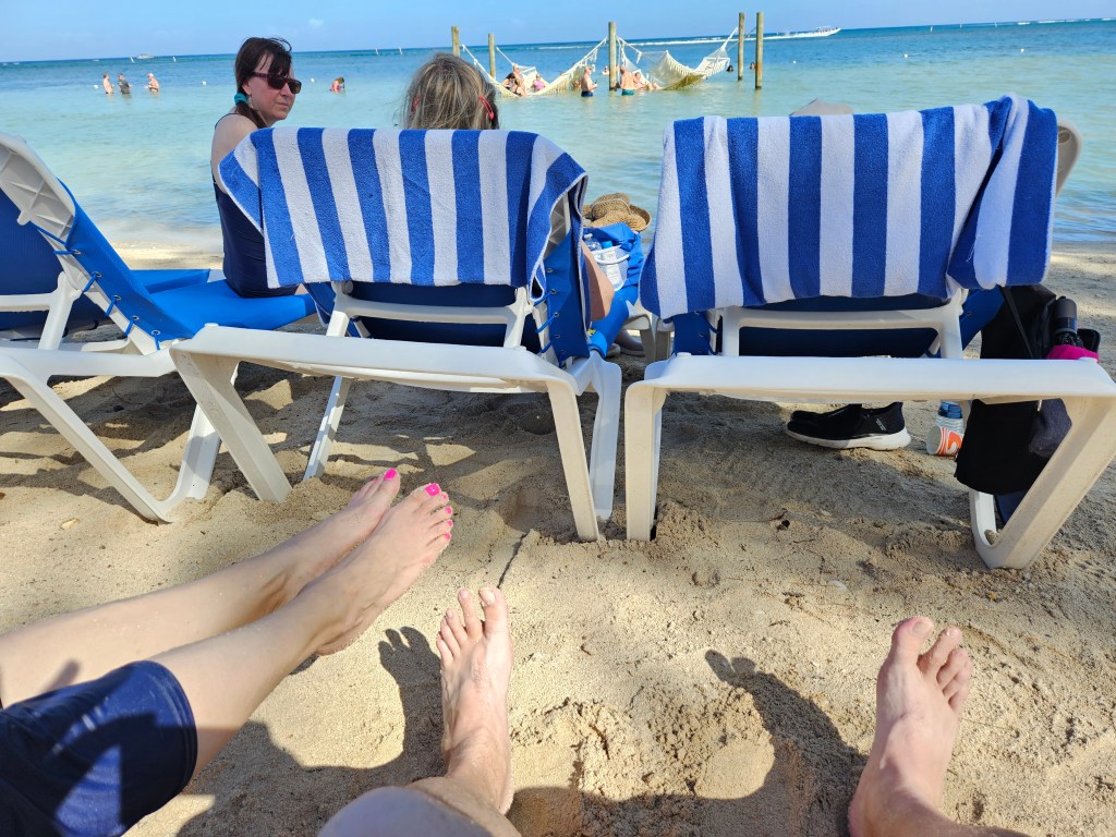 We did not have any excursions planned for Roatan, Honduras. However, after seeing the beautiful water and sand in Costa Maya, I asked Casey if we could book a last-minute excursion. We opted to go to a private beach with lunch and unlimited drinks. The beach area was beautiful. The salespeople were pleasant and not pushy like Costa Maya. For lunch, we had coconut chicken, coconut rice and beans, plantains, and fresh fish. It was a bit out of my comfort zone, but it was all very delicious. I am not supposed to drink alcohol, but Casey let me splurge with a margarita and a strawberry daiquiri. Our tour guide was a very nice kid. Here’s the obligatory feet and sand picture. Check out my pink toes.