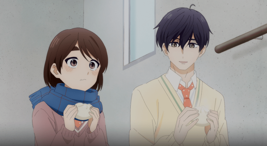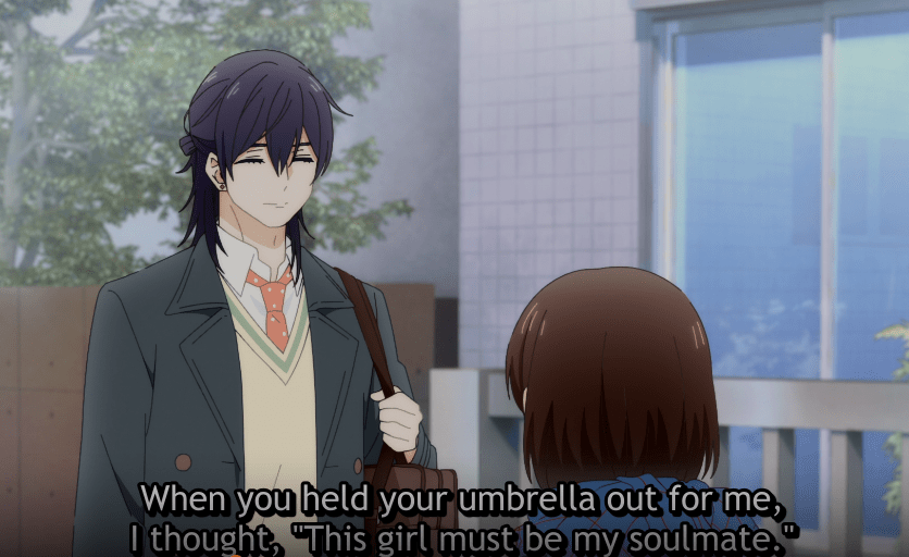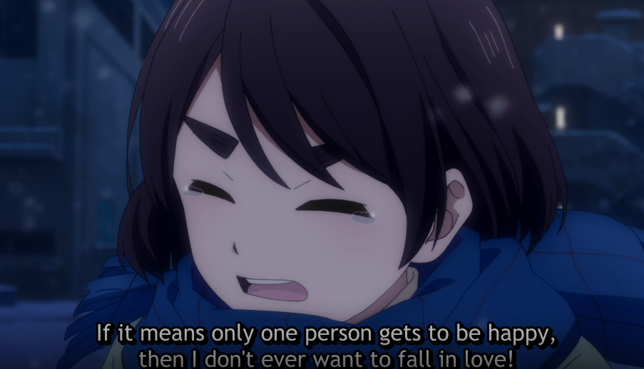 At a different table, our protagonist, Hotaru, and her friend, Kyo, are eating parfaits. They turn around to observe the break up. Kyo notices the male as a classmate, Hananoi. She concludes that even the ultra-handsome goes through terrible breakups. Hotaru makes it clear that she can’t be bothered with love if it meant caring about someone more than family and friends. After eating their snacks, the two girls part ways. On the way home, Hotaru notices Hananoi sitting on the bench collecting snow on his shoulders. Out of a gesture of kindness, she covers him with her umbrella and tells him he’s going to catch a cold.