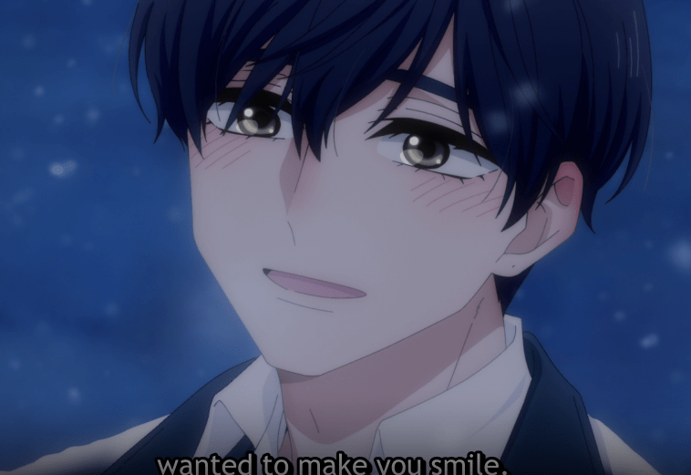 She arrives at the school to find Hananoi bent over in the snow, wet and cold, looking for her hairpin. Hotaru tells him she still doesn’t understand his feelings and why he would go to such lengths. He replies that he wanted to make her smile.