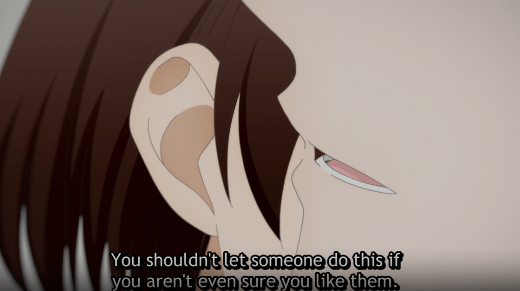 They go to Hananoi’s house. Hananoi mentions that his parents are overseas and that they’re doctors. He tells her to wait for him in his room. She looks around and notices his extensive collection of books. She sees a shelf with a curtain. As she tries to open it, he stops her. He tells her it is a shrine dedicated to her. She decides not to look. As they are talking over tea, she admits that she can’t see someone trying to try anything “lovey dovey” with her. During the conversation, Hananoi realizes that she still doesn’t see him as a boyfriend. He reiterates he has no intention of being her friend if it doesn’t work out. He will disappear. She then proposes her idea. She wants him to try to kiss her. She explains that her friend’s boyfriend suggested it to see if she likes him. Hananoi agrees. He tells her to close her eyes. She gets nervous. Instead of trying to kiss her, he whispers in her ear: