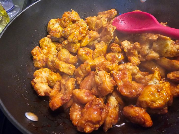 - Toss cooked chicken into pan and coat.