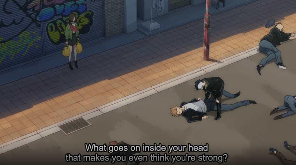I think this show is going to be very interesting. It’s always fun to see a redemption arc. Here, we have a boy that was treated poorly simply because he looked different. Over time, that prejudice turned him into a delinquent because that is what everyone assumed he was. In reality, he has a good heart as demonstrated by handing the old man the bag he left behind and helping to save Tachibana. He is not used to kindness and his shyness is understandable. I look forward to all the fighting to save the neighborhood. Will continue to monitor.