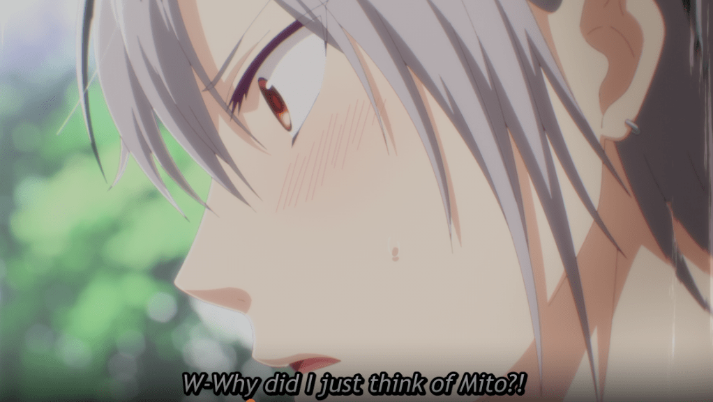 After Maina leaves, Ruka immediately wants to feed. As Ruka is feeding, Mito’s stomach gurgles. Realizing that he has been the only one eating, he feeds Mito a strawberry. Then he admits he was lonely without Mito. He asks Mito if there is anything he can do for Mito. She wants to confess and tell him she wants him to love her as a woman, but she knows she can’t. Instead, she asks that just the two of them go somewhere. He agrees and then realizes…