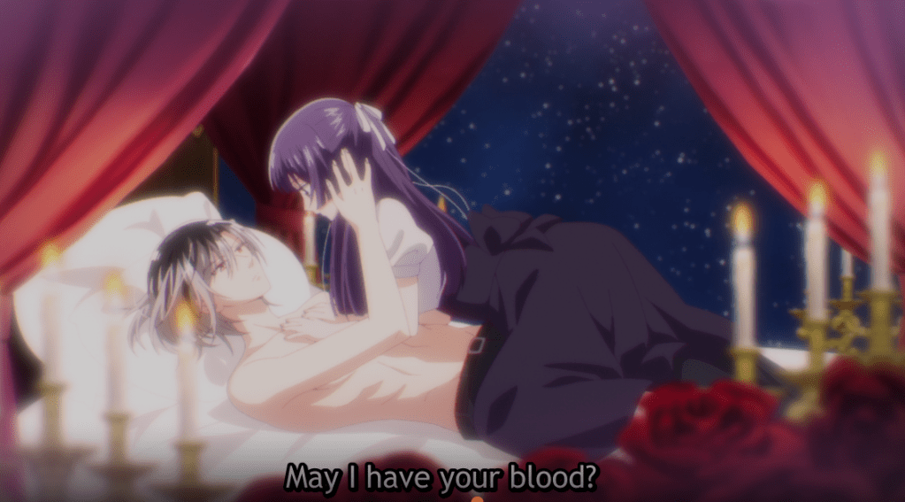 Meanwhile, Ruka wakes up with Maina leaning over him. His body reacts to her strawberry scent. He wants to feed, however, he has Mito on his mind. Despite her smell, he turns her down. He admits that Mito is the only one on his mind. Bursting into the room, Mito is carrying the dessert. She thinks she is interrupting something, but then blurts out an apology to Maina and states that she is the one that belongs by Ruka’s side.
