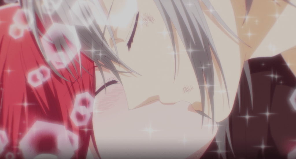 When they break the kiss, the wounds on Ruka’s face disappear. Mito immediately thinks the kiss was because she had bit her lip and had blood on her lips. Ruka agrees to waive off the awkwardness. Internally, Ruka admits it was a real kiss.