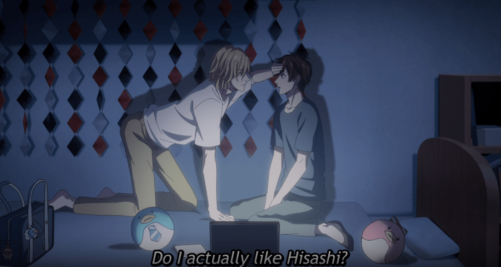 In their room, they gear up to watch a movie together. During the movie, Hisashi admits that he wants to act in the movie to learn more about Mao. Hisashi admits that he thinks Mao is awesome because he is so dedicated to his club. Mao realizes how selfish he has been and didn’t take Hisashi’s feelings into account. Mao admits to Hisashi that the thinks he is perfect for the role. Mao brings out his phone and tells Hisashi to read some of the lines. As he reads one of the lines about asking if the other protagonist likes him, Mao drops the phone and makes a sudden realization.