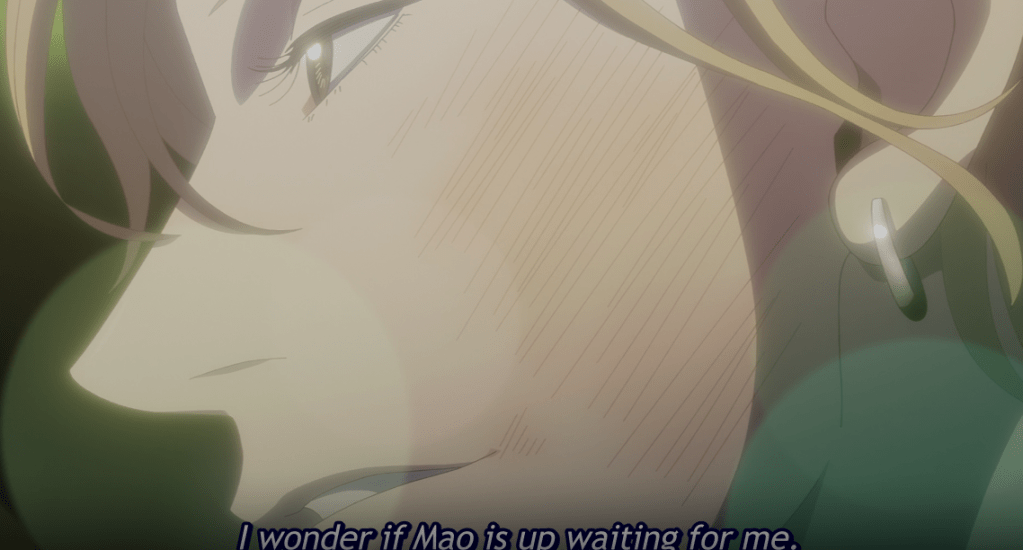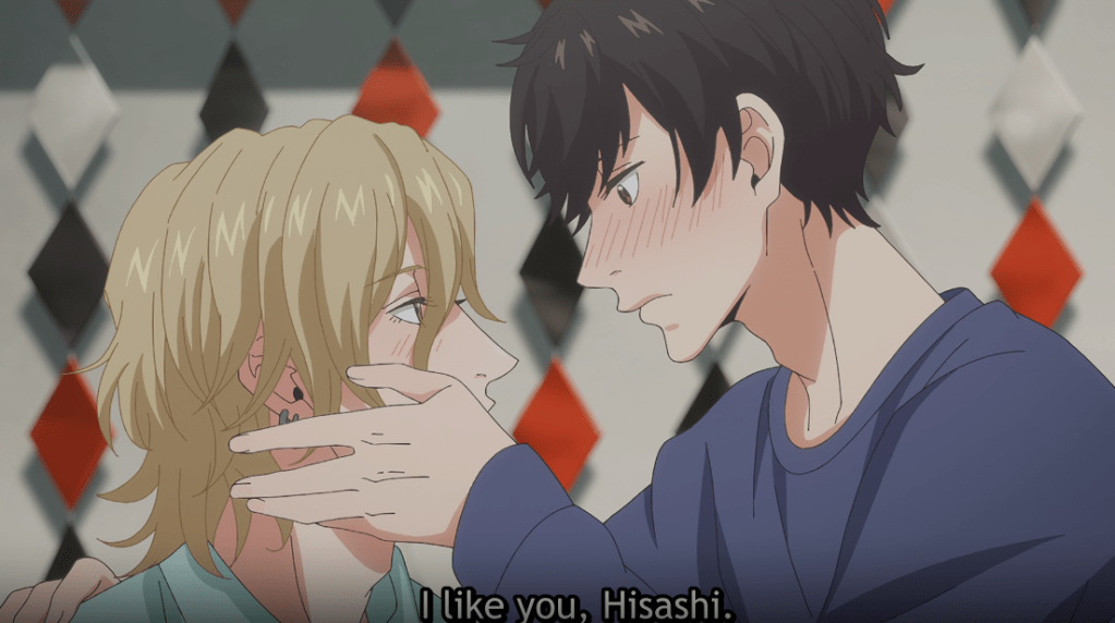 Hisashi leans his head against Mao’s and says he needs to recharge. Mao reflects on how each of these small moments have probably led up to his feelings changing for Hisashi.