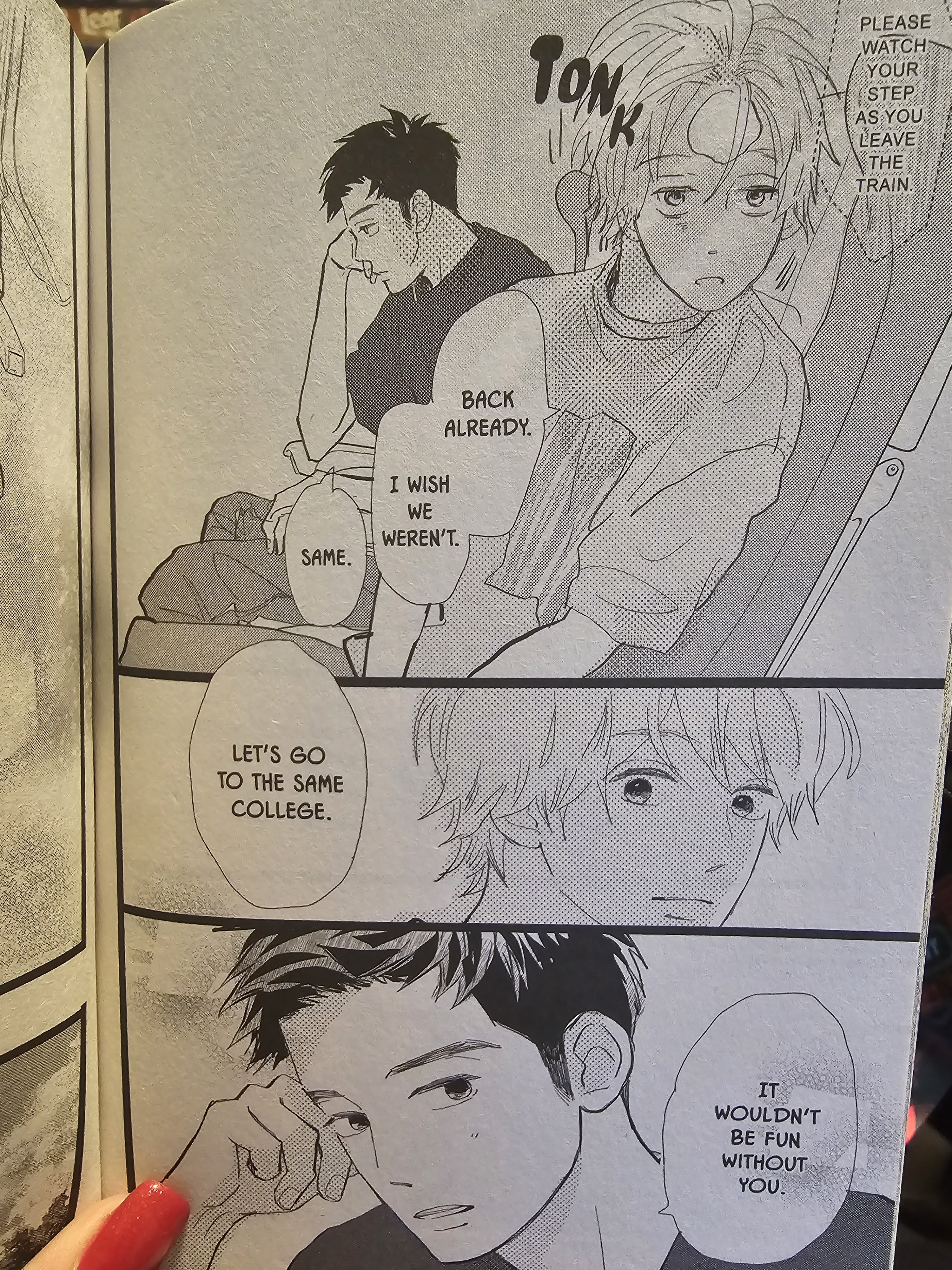 The day of open campus arrives and Aoki is a wealth of knowledge. He thanks Aida by text. Aida is sitting with Hashimoto in the library. He wishes that he was in Kyoto, but also realizes that studying with Hashimoto has brought his grades up. It’s the end of open campus day and Ida wants to talk to Aoki. Aoki is convinces that Ida is going to break up with him. As they talk, Ida apologizes for sulking. Ida comes to the realization that he’s changing. He normally doesn’t bat an eye at being alone, but for some reason, things are different with Aoki. When they arrive at the hotel, they realize…there is only one bed.