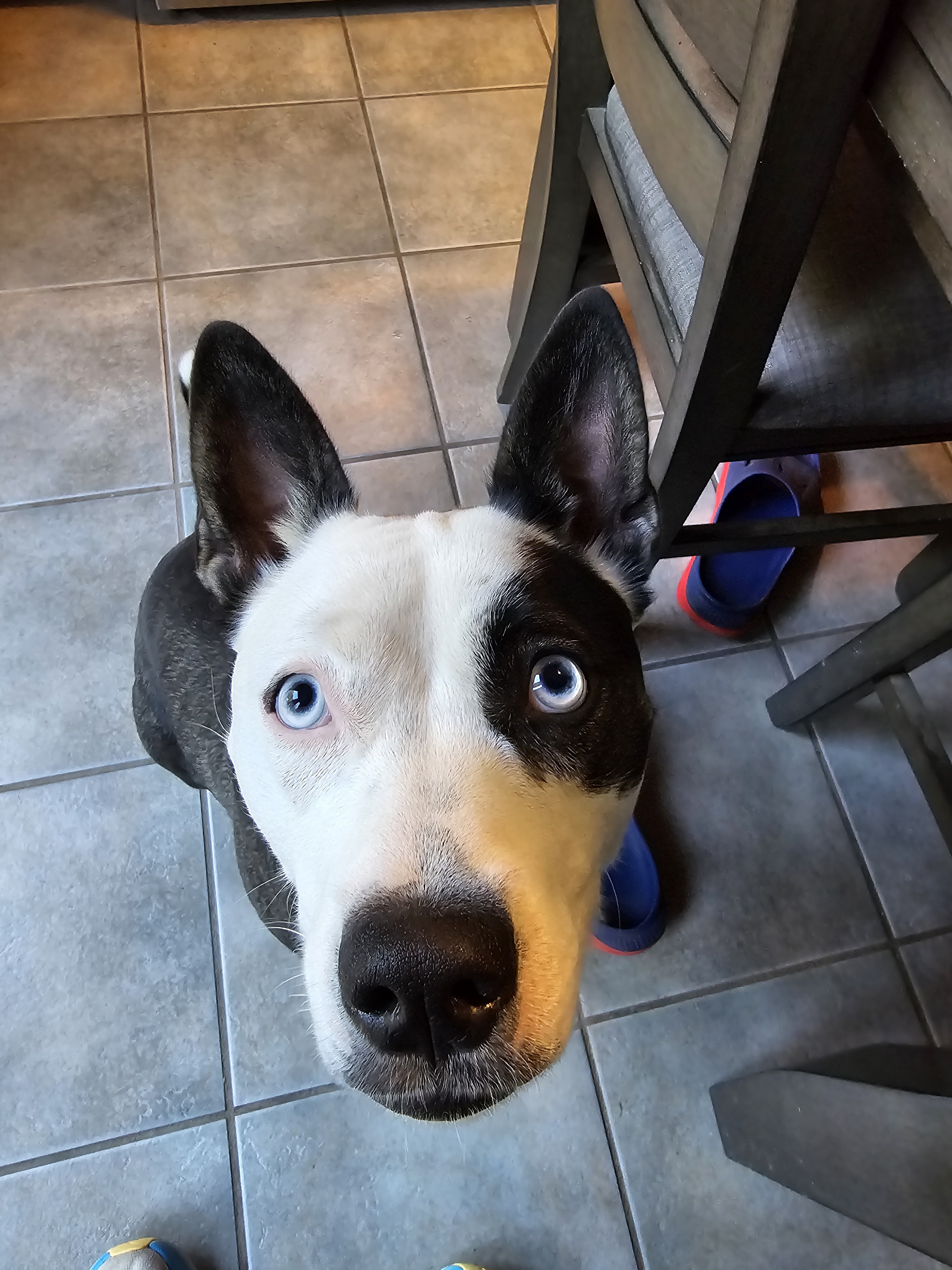 Meet Rikka. She is named after an anime character that wears an eyepatch. She is a one-year-old pitsky. She weighs roughly 54 lbs. She is half Siberian husky, half American bully. She is high energy, but we love her all the same. Lately, she has been trying to smother me in my sleep with her cuddles. I figure she thinks of me as part of her pack. She kind of snuggles up to me like I am the base of a dog pile. She doesn’t talk a lot like a full husky, but she does insert her opinion here and there. It’s so freaking adorable when she does. She knows how to sit and lay on command. She is very treat-motivated. She loves the outside. It’s hard to drag her in even in the Texas heat. I have to holler “biscuit” before she decides, on her own terms, that she is ready to come in.