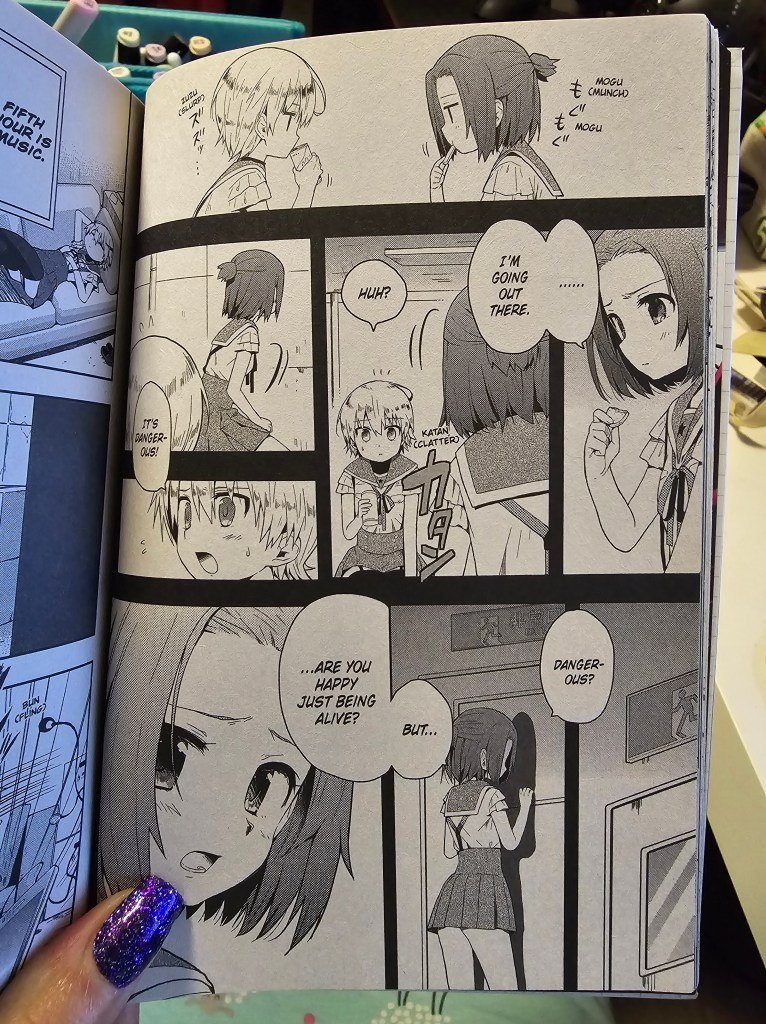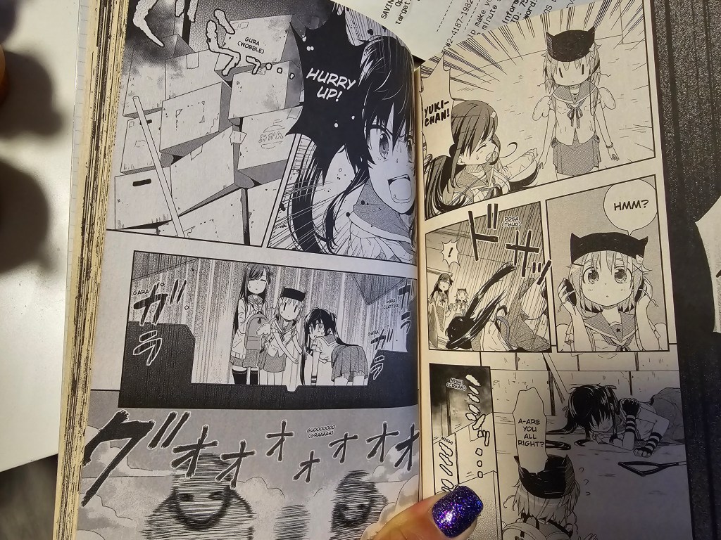 I’m glad that they found another survivor. In this volume, we really see the extent of Yuki’s trauma. She’s stuck in time only seeing a world before the zombie invasion. The girls do their best to keep her happy and not traumatize her further. However, in the mall, we see a glimpse of her memories of Megu-nee which prompted her to run to find the stranger. At this point, I am convinced that Megu-nee is dead. I am really liking this series!