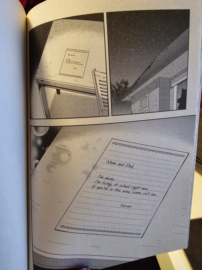 Rii, Yuki, and Kurumi are navigating the blocked streets. They end up in front of Kurumi’s house. She goes in alone looking for any survivors, but finds no one. She jots down a note for her parents to let them know she is staying at the school.