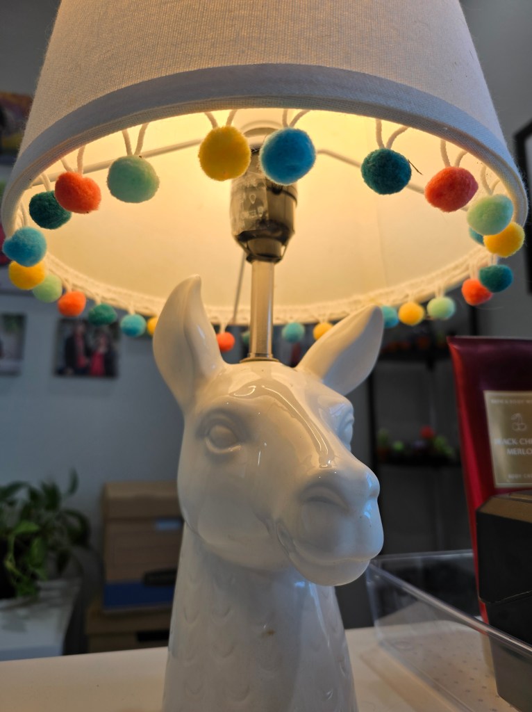 Meet my llama lamp. My father-in-law had given me a gift card a few years ago and I saw this beauty at Target. It’s been a part of my work office ever since. He has since passed, so the lamp means a lot more to me now. It brings a smile to my face.