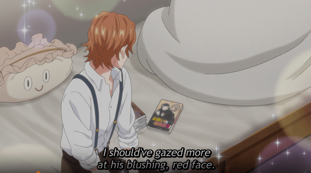 Kikuchihara definitely has a crush on Ichikawa. However, he doesn’t want any of his third-year film crew to find out. That evening, Ichikawa is anxiously awaiting Kikuchihara’s return. He has more BL manga to show him. Kikuchihara reads a line from the manga and makes Ichikawa blush. Kikuchihara commences the romantic teasing. He calls Ichikawa cute and lists all the things he wouldn’t have known had they not ended up living together. Ichikawa covers himself in a blanket with embarrassment.