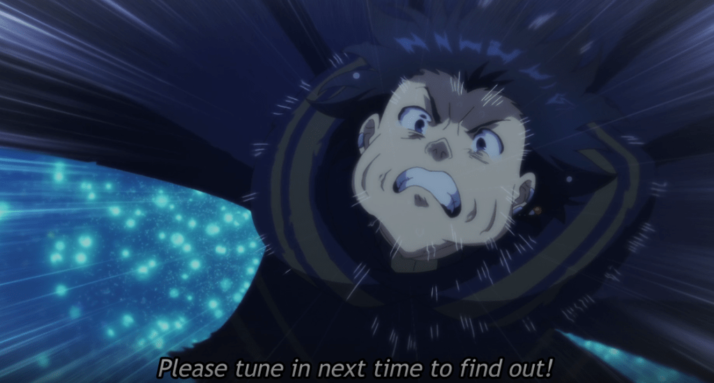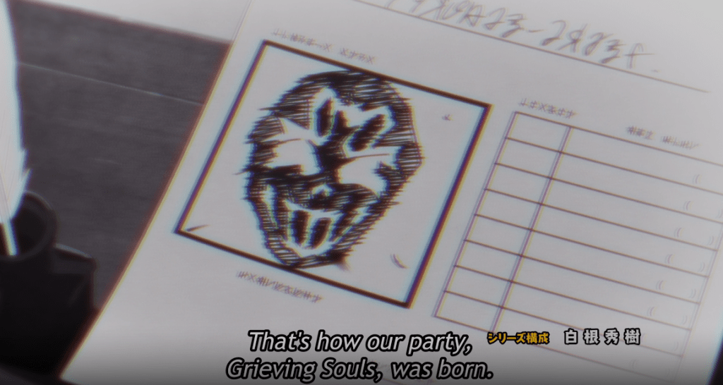 The episode opens with the very young Grieving Souls arriving at the capital Association. Luke kicks down the door and proclaims himself the best swordsman. Liz proclaims herself the best thief. They announce that they’re registering as hunters. Krai goes up to the counter and is told to register his party’s name and crest. In an effort to try to get himself booted from the group, he chooses the name Grieving Souls with a skull-looking crest. At first, they’re against it, but when he mentions he can’t get motivated and has to leave the party, they change their tune.