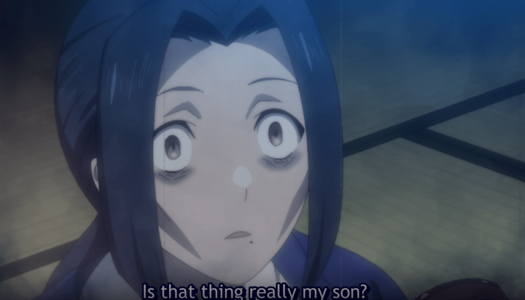 As Koga dresses, he recalls his past. His parents were a wealthy merchant and a beautiful woman. All they longed for was a child. However, as they are praying at a shrine, they are attacked. They rape his wife and she becomes pregnant by her rapist. Her mental state declines rapidly and her husband doesn’t recognize Koga as his son.