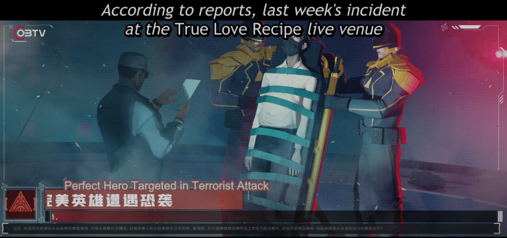 At the top of the building holding his belongings, Lin Ling is contemplating suicide. As he stands thinking, a promo video with Moon, a female hero, plays on a large screen. Then, a commercial with the hero, Nice, comes on. He obviously had a hand in making those promo videos. As he is cursing the virtual Nice, the REAL Nice flies down in front of the screen. Walking calmly, Nice walks onto the ledge. He flashes his trademark pose, and walks off the ledge to his death.