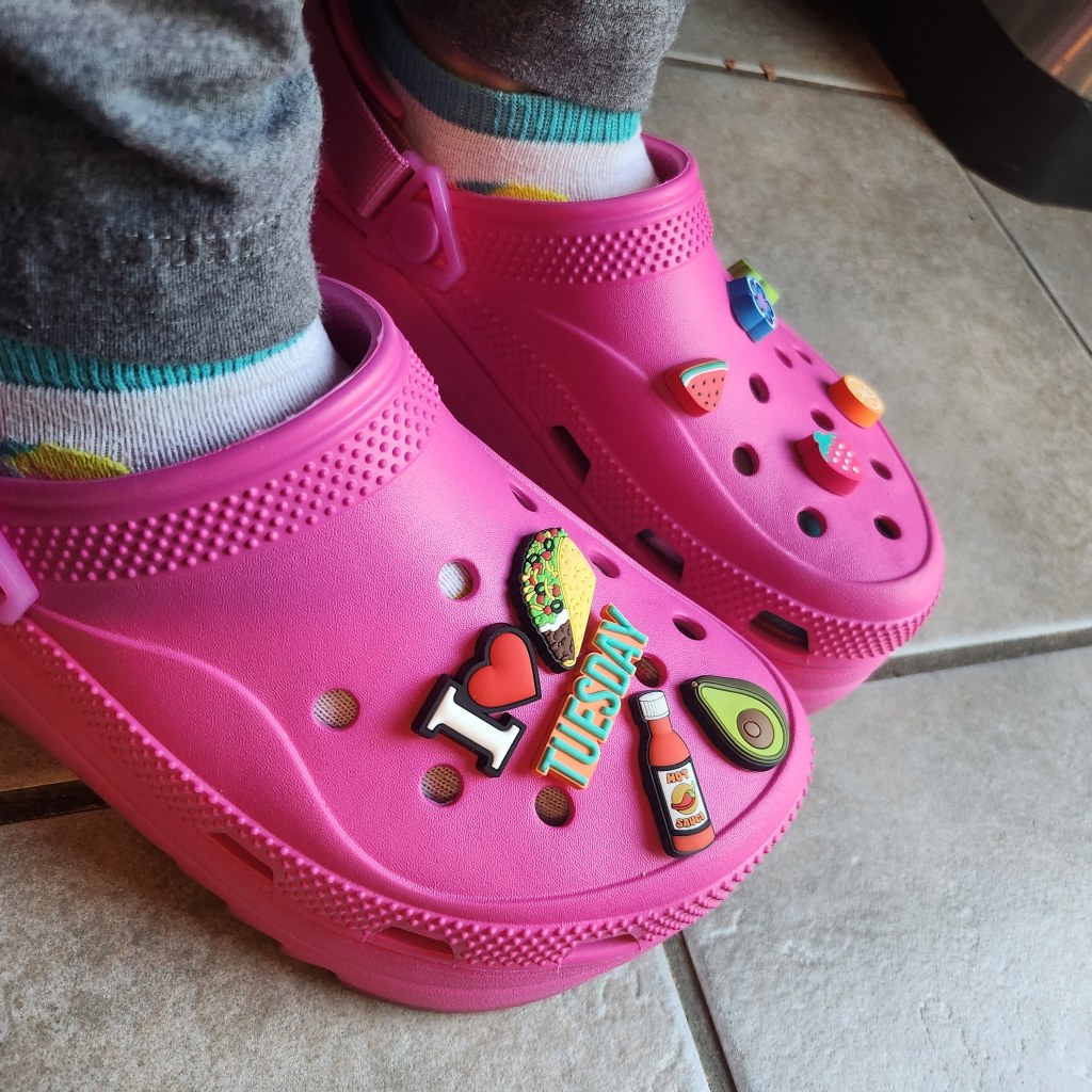 Crocs. I used to hate them. They’re ugly. However, I recently found my love of Crocs. They’re so easy to put on after a long day at work and cruise around the house. They’re great to cook and clean in. They’re also great to throw on when I am too lazy to put on real shoes.