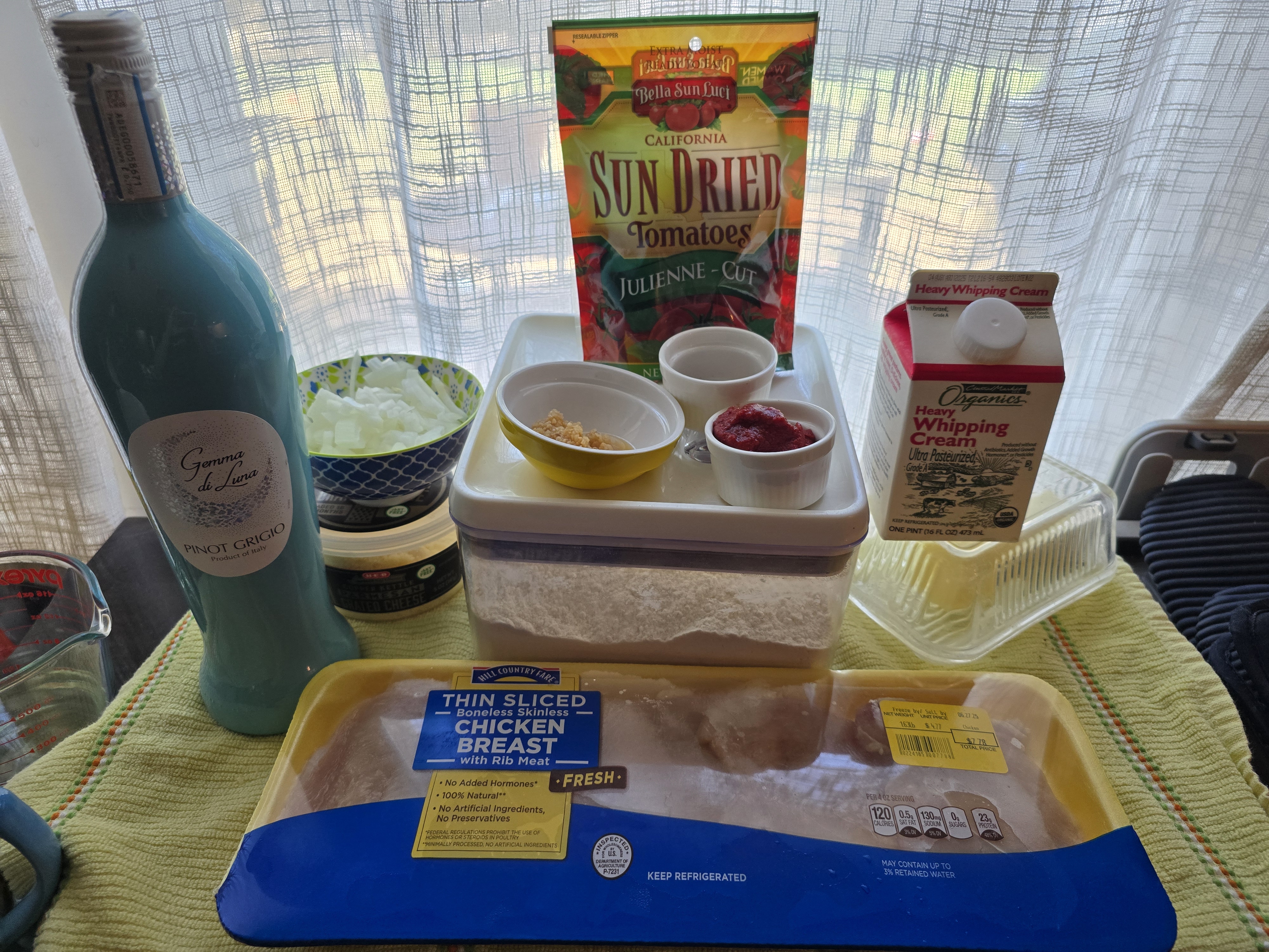 Gather and pre-measure your ingredients. You can either purchase pre-sliced thin-cut chicken breasts (like I did), or slice 4 chicken breasts in half.
