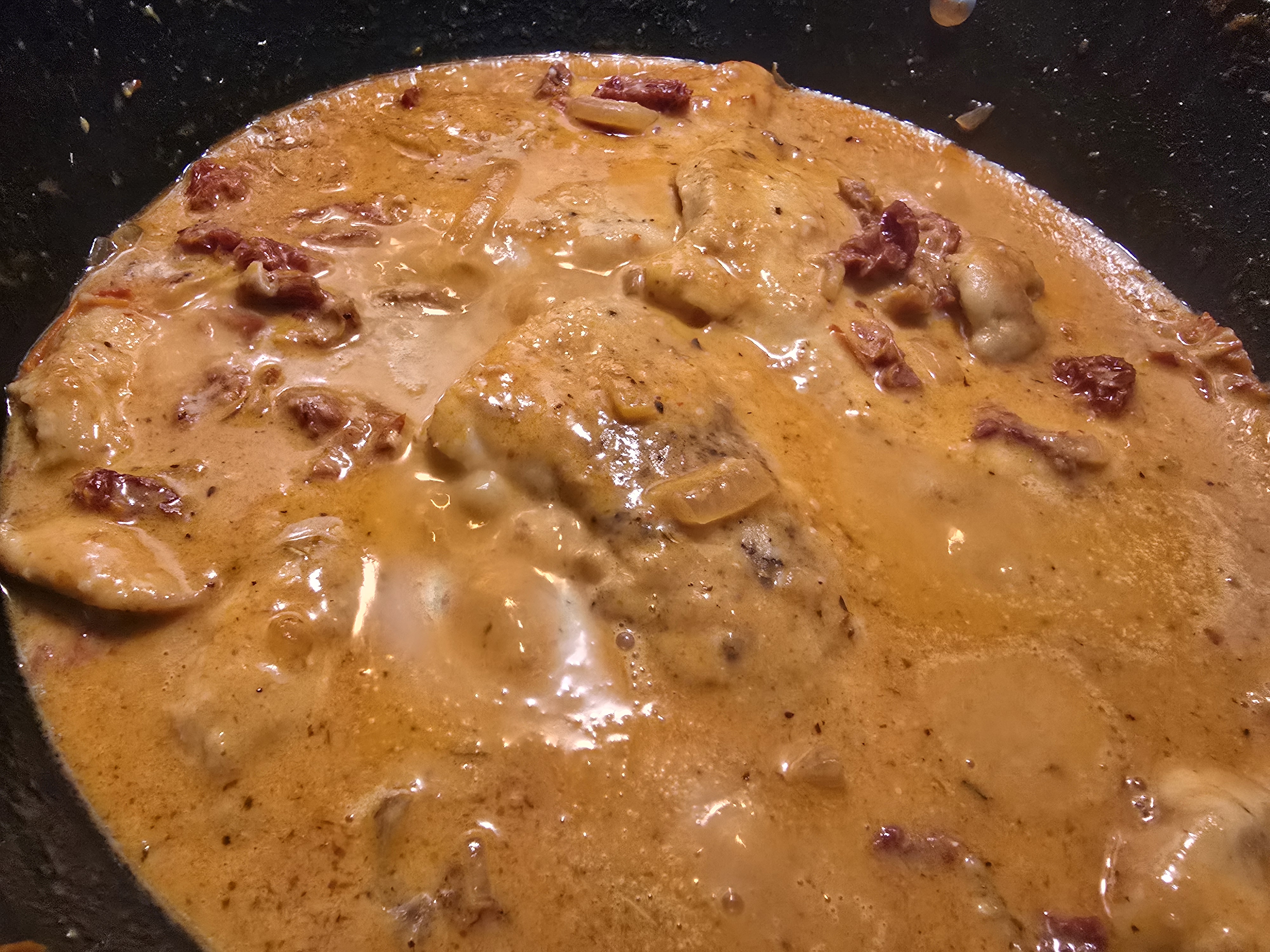 Bring to a simmer. Once at a simmer, add the chicken pack into the pan and cook until the sauce has thickened slightly. Add the cream and parmesan and let simmer for 5-10 minutes.