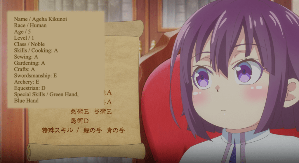 Mr. Romanov asks Ageha about the embroidery he was placing on his cape. Ageha embroidered a special symbol on Mr. Romanov’s cape that wards off evil. He teases Ageha and says doing it properly is the first step to becoming a good wife. They take a look at his stats which support Mr. Romanov’s teasing.