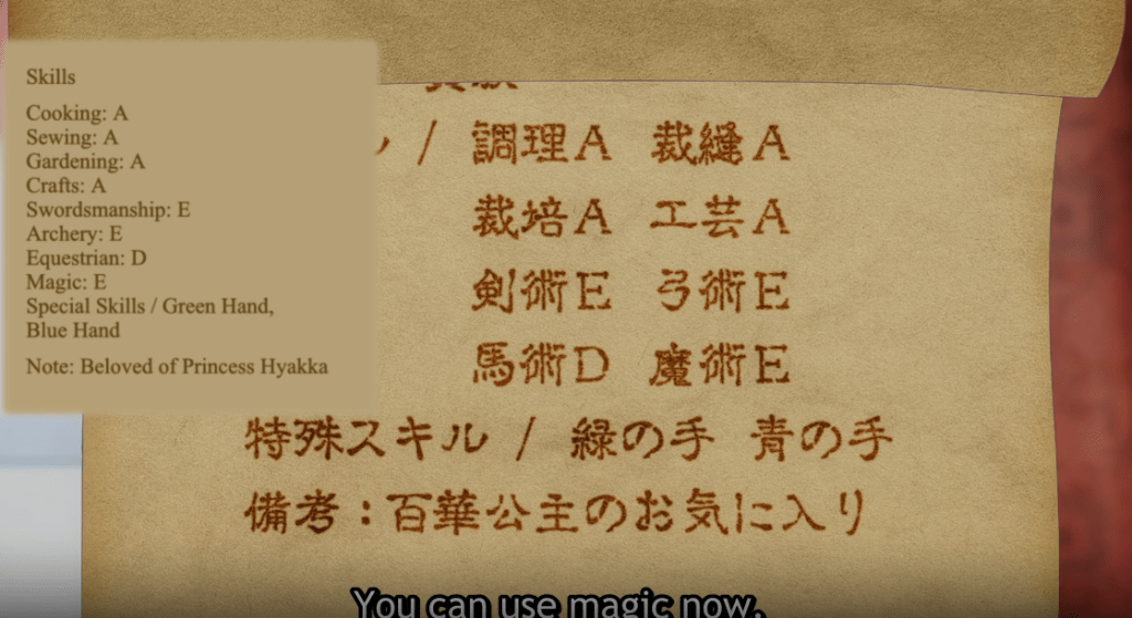 The next day, Mr. Romanov and Ageha looks at his status sheet. He can now use magic, and has a note that he is a beloved of Princess Hyakka.