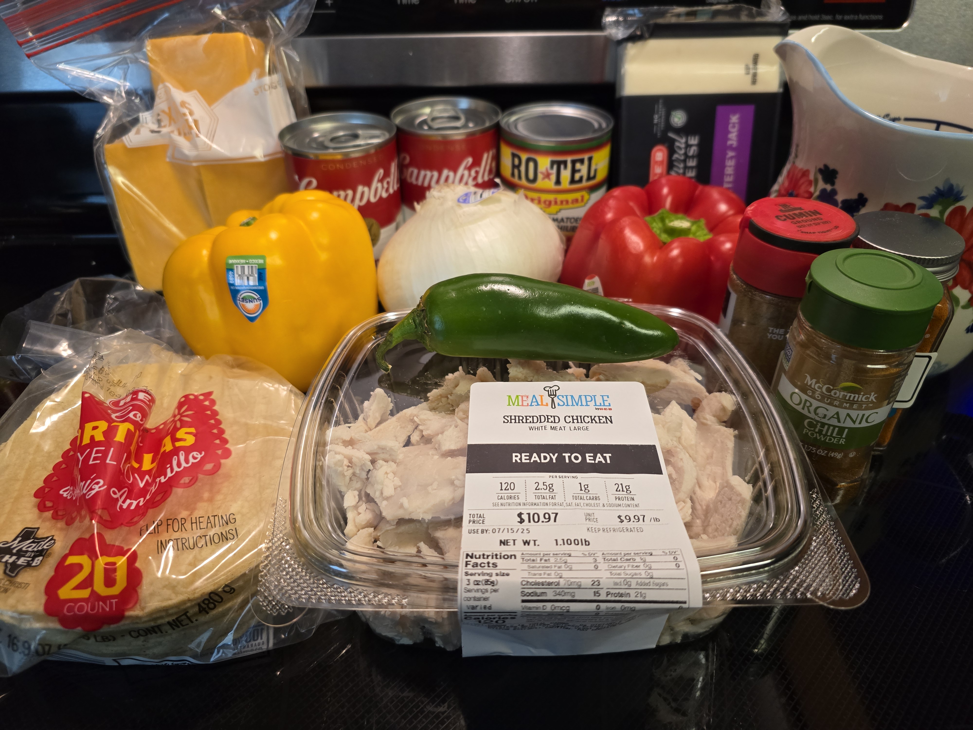 Gather your ingredients. Make note that I purchased 1 lbs. of shredded chicken to use. I didn’t want to take the time to roast a whole chicken. I’d like to point out that this was plenty of chicken, but the recipe calls for a lot more. While 1 lbs. worked for us, you might want to actually follow the recipe and use all the meat from a whole roasted chicken.