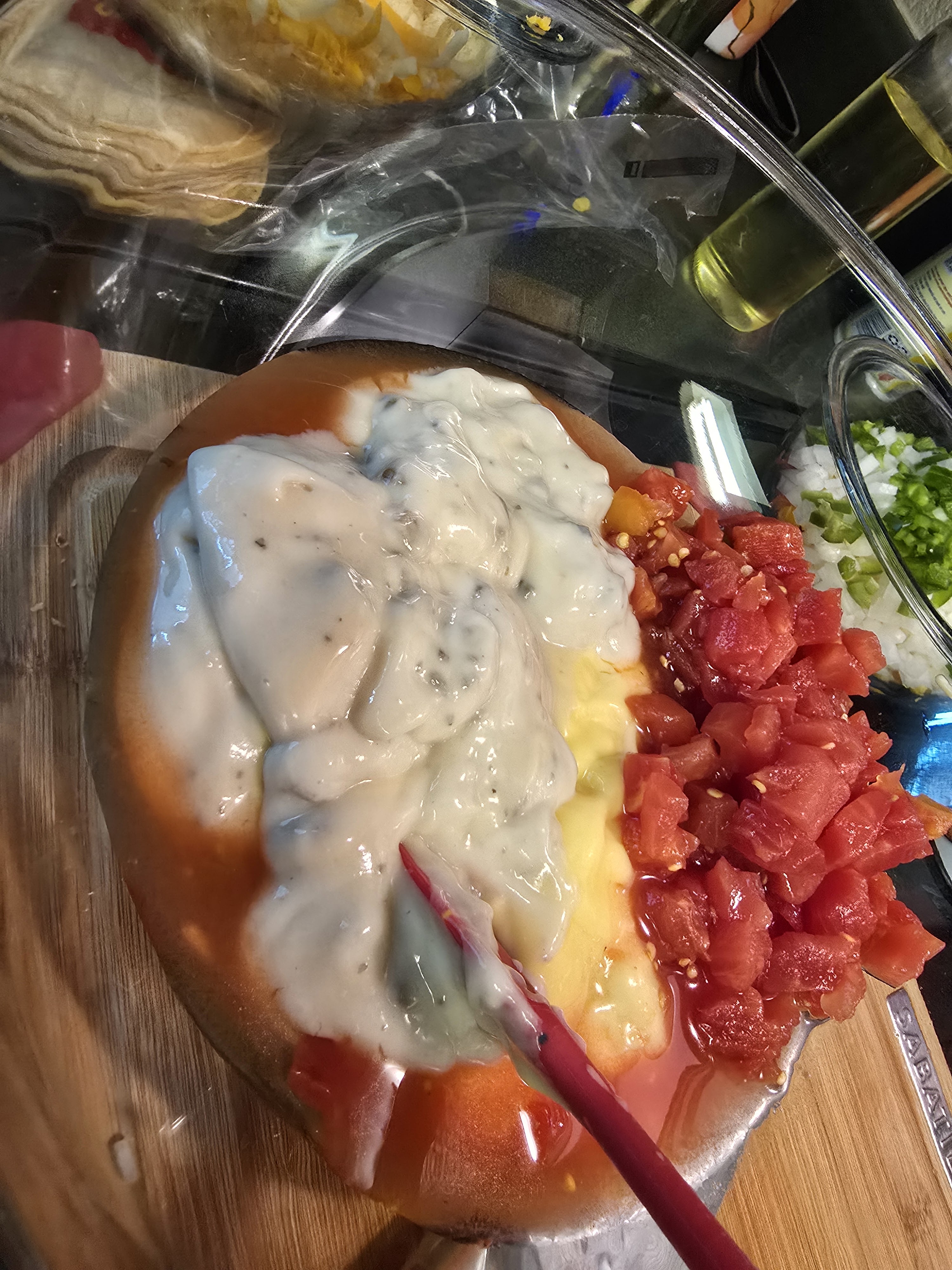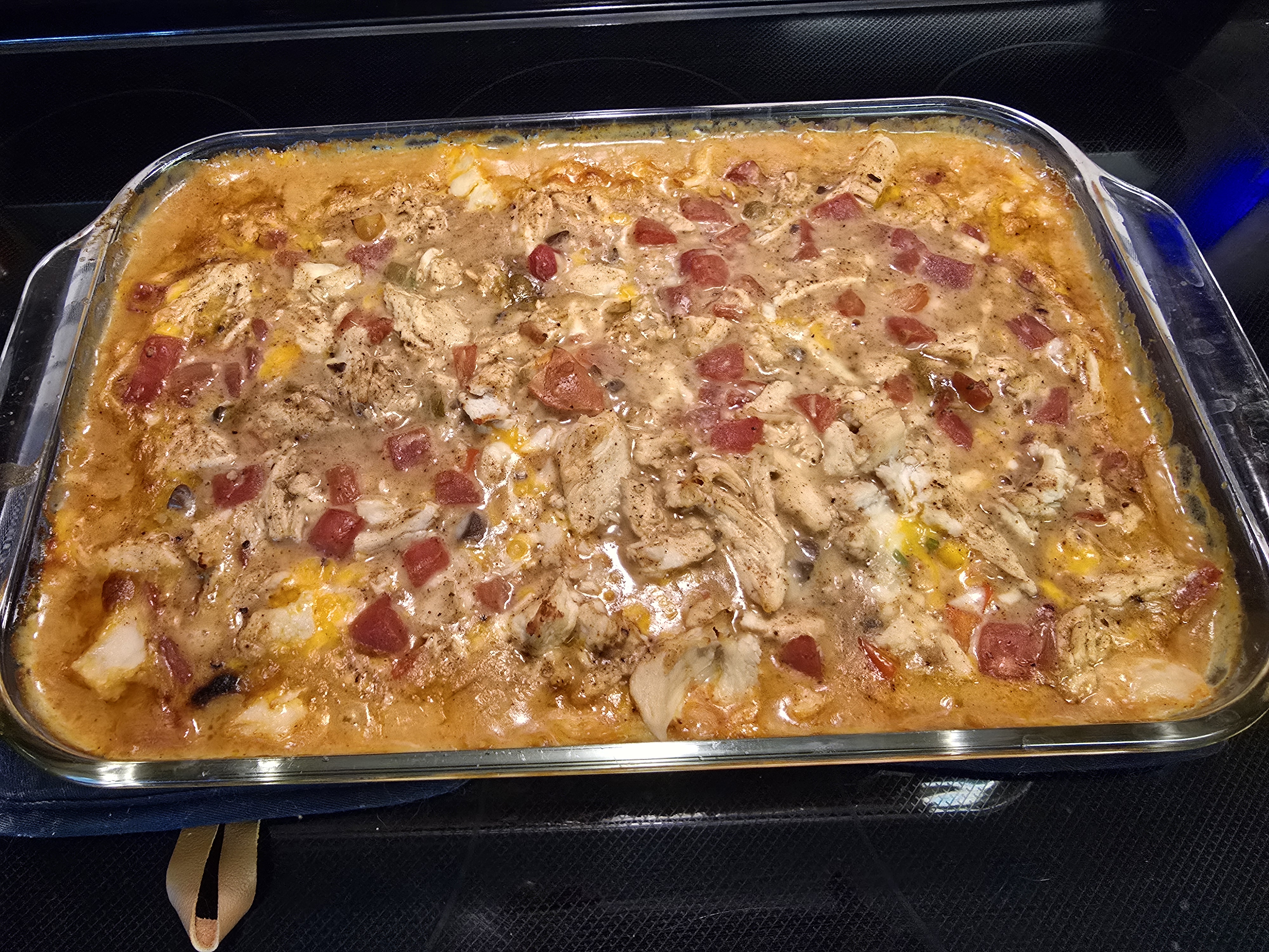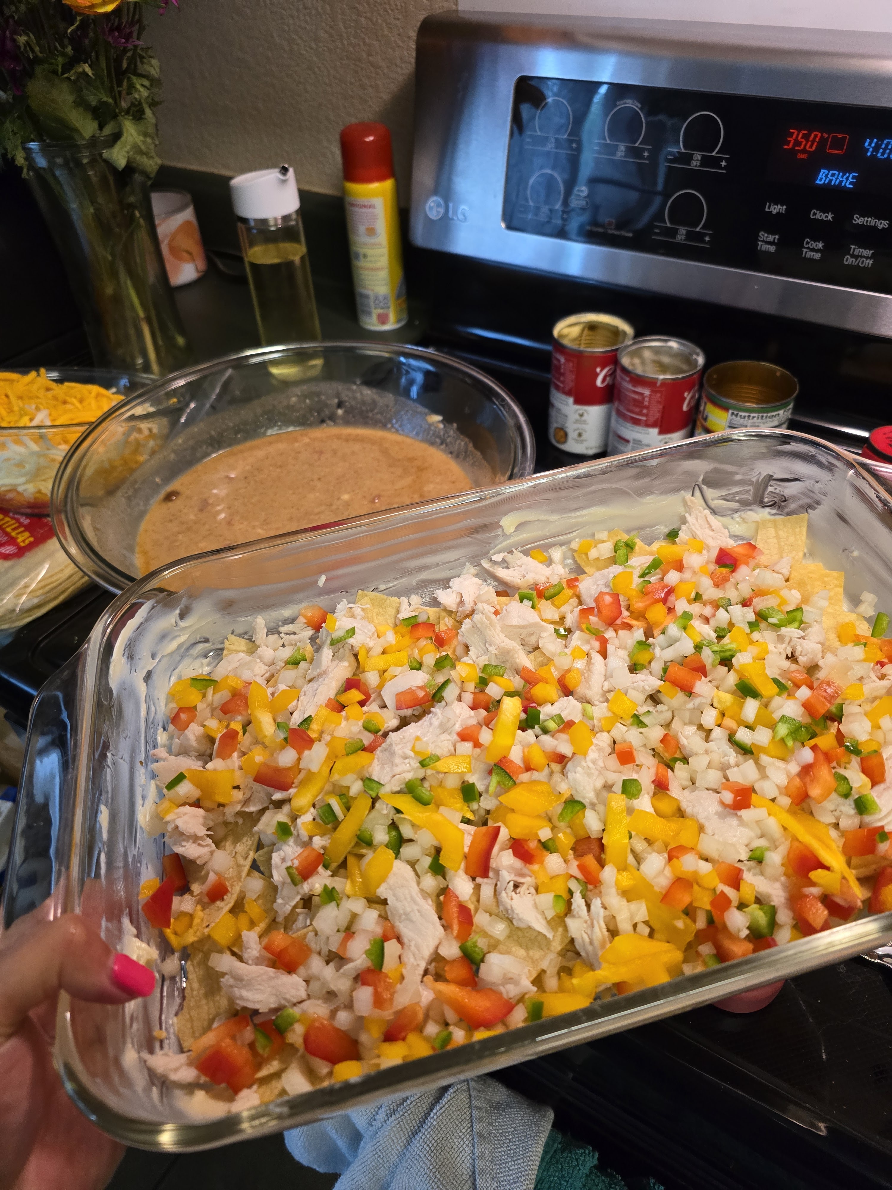 After the veggies, layer on half of the cheeses followed by half of the soup mixture. Repeat the process. The remaining tortillas, chicken, veggies, cheese, soup.