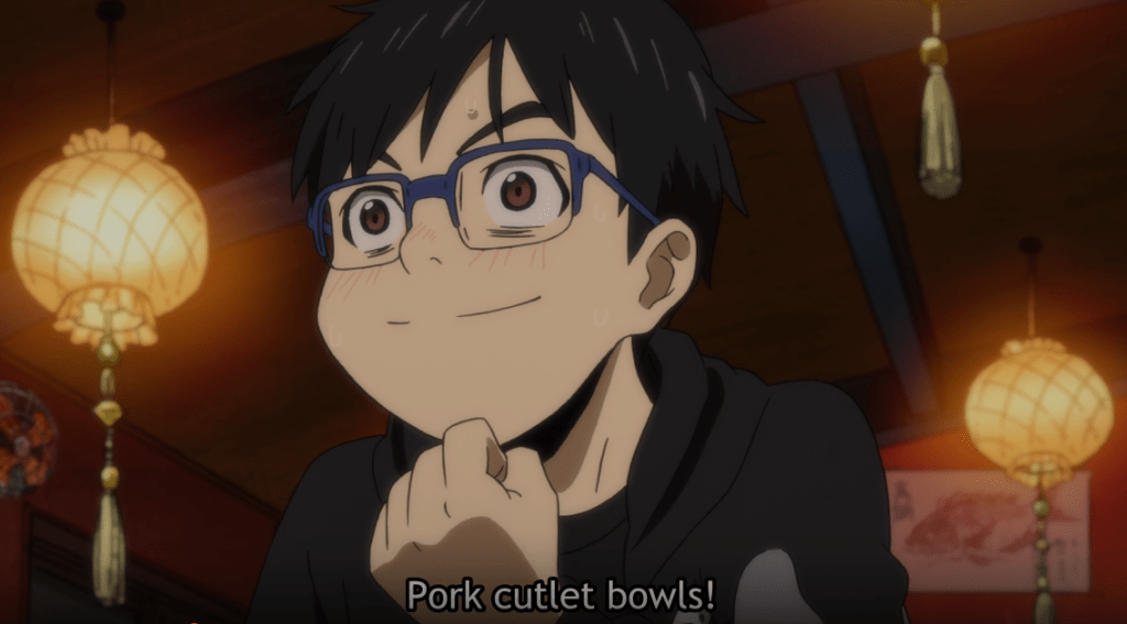 Back at the onsen, Yuri struggles with figuring out what eros means to him. As he sits at the dinner table, he starts drooling at Victor’s bowl of katsudon and asks himself what makes him lose all reason. He suddenly has a moment of clarity and tells Victor that katsudon is eros. Victor lightly chuckles and tells him they will roll with that.
