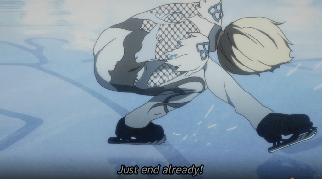 It’s the day of the competition. Yurio goes first. While the first half of his program is skated with agape by thinking of the unconditional love of his grandpa, the difficulty gets to him and he isn’t able to relay that emotion in the second half.