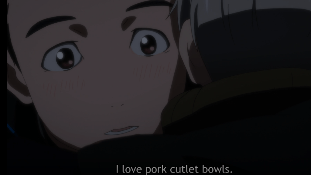 After Yurio’s performance, Yuri begins to have a panic attack. Victor tells Yuri it’s his turn and Yuri comes out of it to tell Victor that he’s going to become katsudon so watch him. Yuri embraces Victor in a hug and Victor says, “I love pork cutlet bowls.” Does that mean he loves Yuri?!