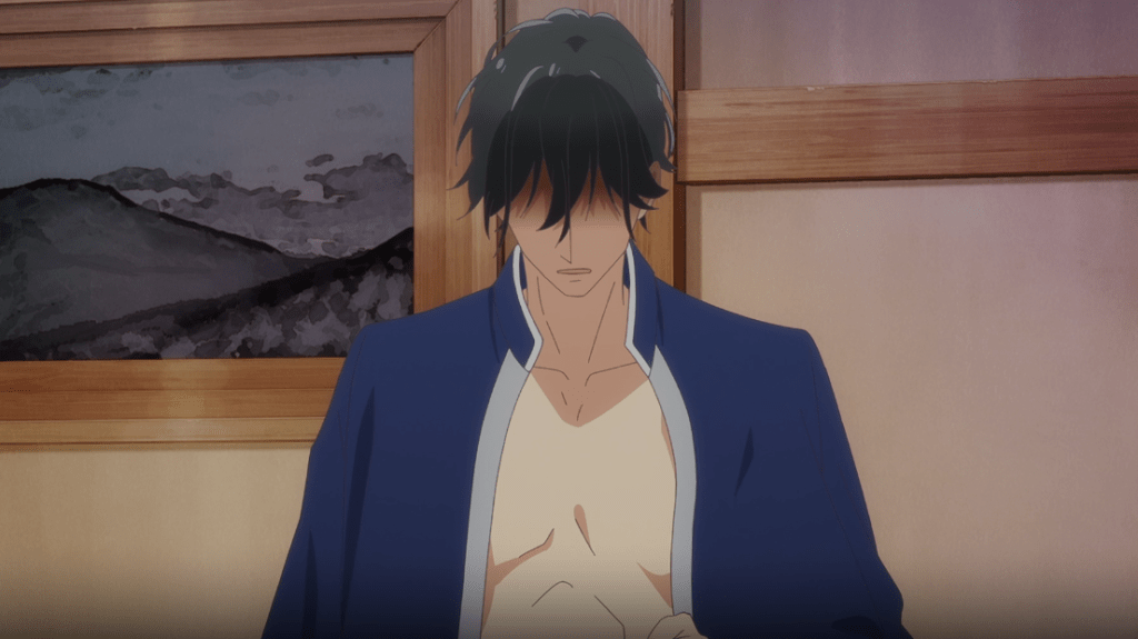 Kondou arrives at work and immediately gets started noting his lower back hurts (lewd!). He begins to think about the events of the night slowly rubbing his fingers on his lips. He smacks himself out of the daydream.