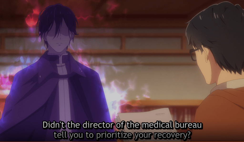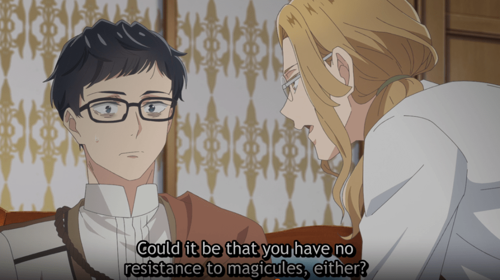 Indolark makes his way to the cafeteria and asks the accounting department where Kondou is. Norbert tells him that Kondou usually brings his own lunch. Indolark makes his way to the accounting office where he finds Kondou working hard. Indolark grabs Kondou and makes him go to the doctor. There, they learn that Kondou has a low tolerance for magicules which occurs even in their world’s food.