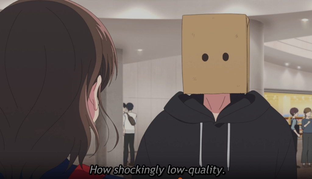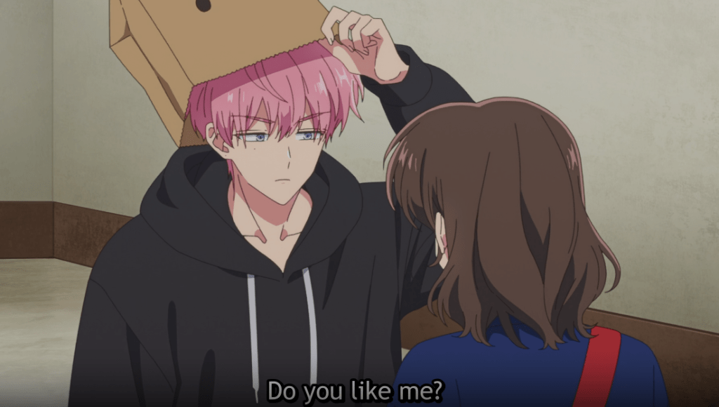 She then takes him to a family restaurant after shopping. She tells him she goes there with her friends. Tamon is a bit jealous. Then, Kinoshita’s friends show up. They try to pressure Tamon to take off his bag, but instead, he grabs Kinoshita’s hand and runs away.