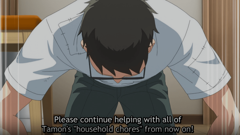 Tamon tries to cook a rolled omelet and butchers it. He starts berating himself, but Kinoshita reminds him that he makes his fans happy. She easily talks him out of being down on himself. There to witness it is his manager. He asks her what entails “household chores” and she says pretty much anything.