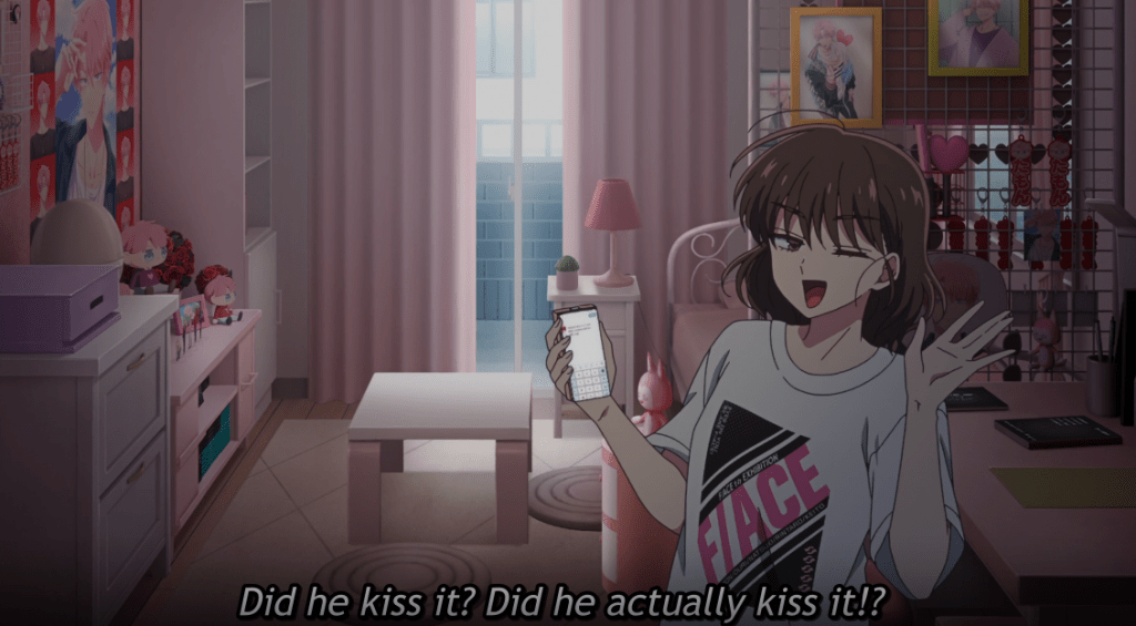 Kinoshita is watching a variety show with Tamon and Ouri, another member of F/ACE. As she is commenting on their social media, she suddenly has a flashback of Tamon kissing the necklace she picked.