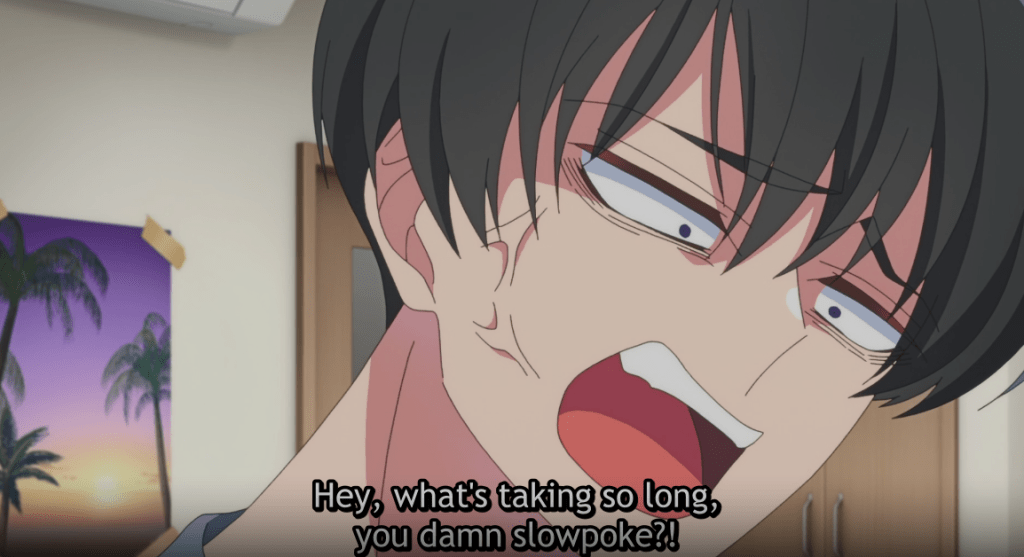 Kinoshita panics, gets up, apologizes, then runs away dropping her homemade F/ACE fan. When she realizes it, she goes back to Tamon’s place. She rings the doorbell, but no one answers. She enters and hears someone yelling at Tamon. She advances further into the apartment and finds Ouri yelling at Tamon and hitting him with her homemade fan.