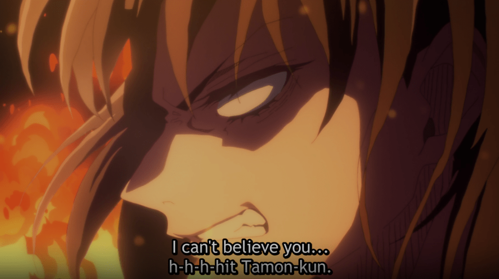 Ouri shows up and Kinoshita straight-up ignores his presence. When Ouri tries to call Tamon a one-trick pony, Kinoshita tells him how hard Tamon works. Frustrated by how everyone loves Tamon and how he isn’t center, he grabs Kinoshita and tells her: