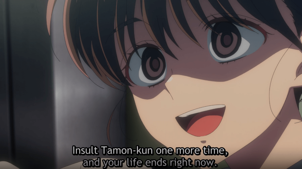 Kinoshita makes Tamon tea before she leaves. As she leaves, Tamon stops her and asks her to please watch the show. She agrees. As she is about to exit the elevator, Ouri is waiting for her. He threatens her to not talk about his true nature. He doesn’t trust her and tells Kinoshita he can make Tamon do anything for her. She’s insulted.