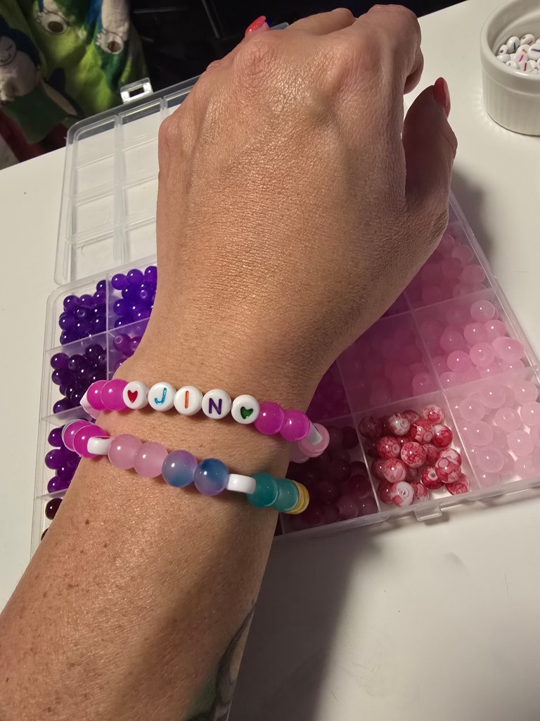 Bracelets. I have never made jewelry before, so I have no idea why I decided to make bracelets. Luckily, my best bud, Brad, knows his stuff and kind of walked me through his supplies and tips and tricks. I find it oddly satisfying. I settled on making 25 of each member’s name for a total of 175 sets of freebies. I decided instead of going all purple, I matched their known microphone colors. So far, I have completed JIN in pink and JUNGKOOK in purple.