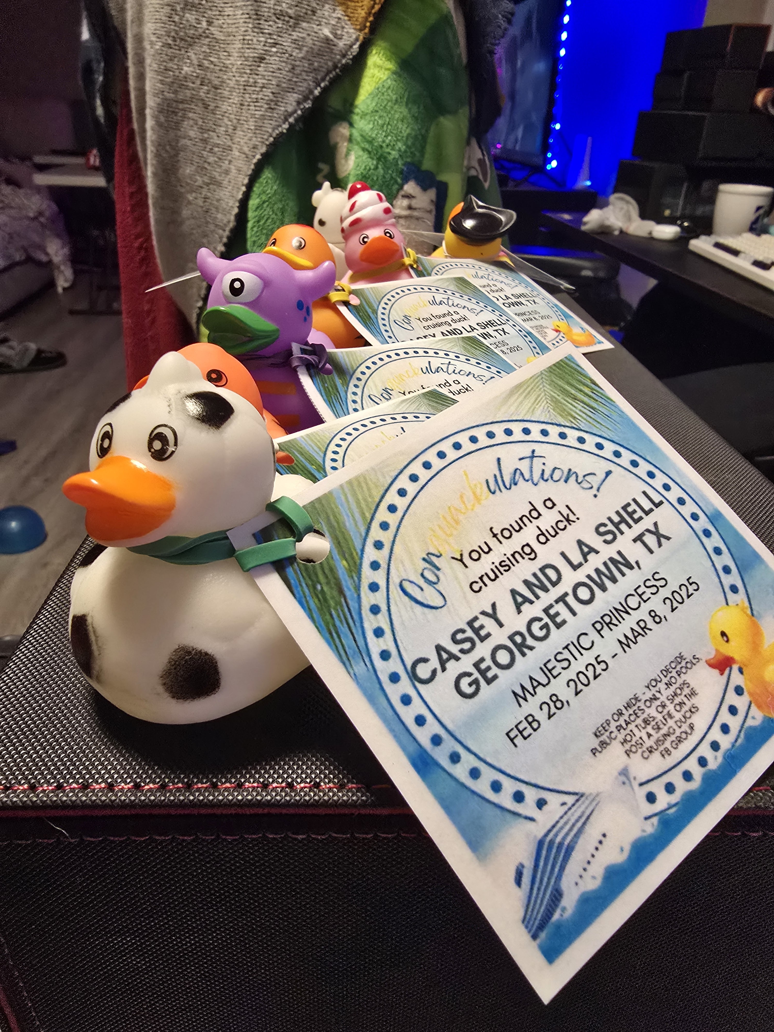 Cruising Ducks. Intertwined with all the hype is our cruise coming up in less than 30 days. I printed out our duck tags and laminated them. Then, I attached them to 50 ducks. It’s going to be fun passing these out.